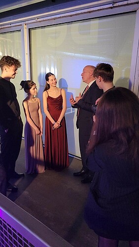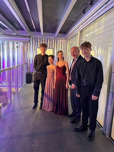 Die Schwestern Kaja (15) und Klėja Kašubaitė (13) (Klasse Prof. Markus Groh) veredelten die konzertante Feier zum 27. Jahrestag der Wiederherstellung der Unabhängigkeit Litauens musikalisch. Das Foto zeigt die beiden mit der Regierungschefin Litauens, Ingrida Šimonytė und dem litauischen Botschafter Ramunas Misiulis.