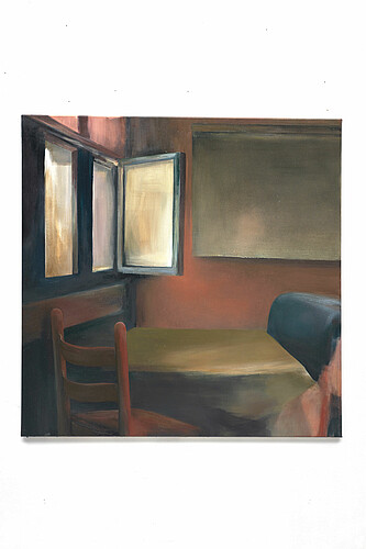 Emma Kucharziks Arbeiten erforschen das Genre des Interieurs: Wie fungiert es bei Vermeer, Menzel oder Hammershøi als Vehikel, um eine bestimmte Bildtradition voranzutreiben, aber auch um Räumlichkeit und Zeitlichkeit zu vermitteln oder zu entziehen? Die Malereien greifen diese wieder und wieder zitierten Motive auf, setzen sie aber einer schwer ergründbaren Atmosphäre aus. Die Möbelstücke auf den Bildern lassen sich kaum zeitlich einordnen, die gewählten Bildausschnitte schweigen über die räumliche Umgebung. Und dahinter scheint die grundsätzliche Frage durch: Wo sind die Menschen, die diese heimelig unheimlichen Räume bewohnen?