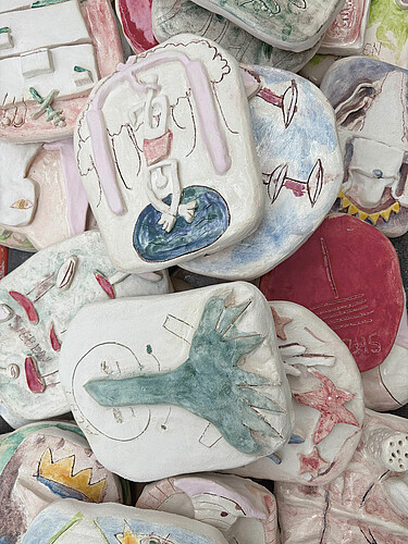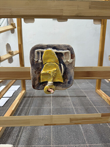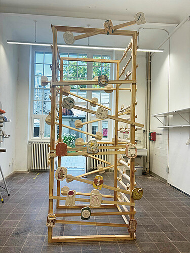In der Architektur und der Kulturgeschichte steht der Turm für Kontrolle, Macht, Beherrschung. Er ist vertikal, monumental, ein Instrument der Abgrenzung. Ob Wachturm, Kirchturm, Büroturm: Das alles sind Orte der Überlegenheit und Isolation. Sie sind Ausdruck patriarchaler, funktionaler Systeme, zuweilen phallische Symbole. „Der Anti Turm“ stellt sich gegen dieses Bild. Seine Struktur ist offen, durchlässig, instabil. Vier Seiten, jede mit einer eigenen Ordnung, formen eine fragile Konstruktion aus Holzlatten. Die Wiederholung der Latten erzeugt eine Art visuelles Raster, das an ein Notensystem erinnert. An diesen Linien erscheinen punktuell keramische Fragmente. Jedes Stück ist einzeln geformt, gezeichnet, geprägt. Sie sind meine persönlichen Interpretationen verschiedener Tarotkarten, nicht als festgelegte Bildsymbole, sondern als gestisch, materiell und intuitiv erforschte Zustände. Die Keramiken wirken wie Erinnerungen, Projektionen oder Zeichen. Einige erzählen, andere bleiben abstrakt. Die Zwischenräume sind nicht leer, sondern bedeutungsvoll.