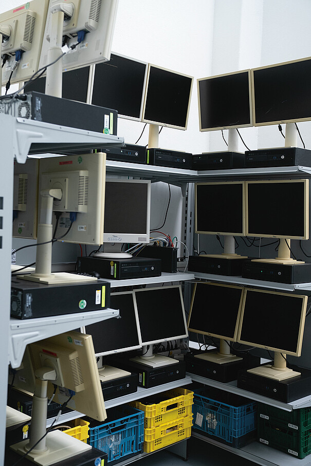 Mixed Media Installation, 2,50 x 1,25 x 3 m 3 Industrieregale, Computer, Monitore, Ethernet-Switch, Strom- und Datenkabel, Kisten mit Werkzeugen und Materialien