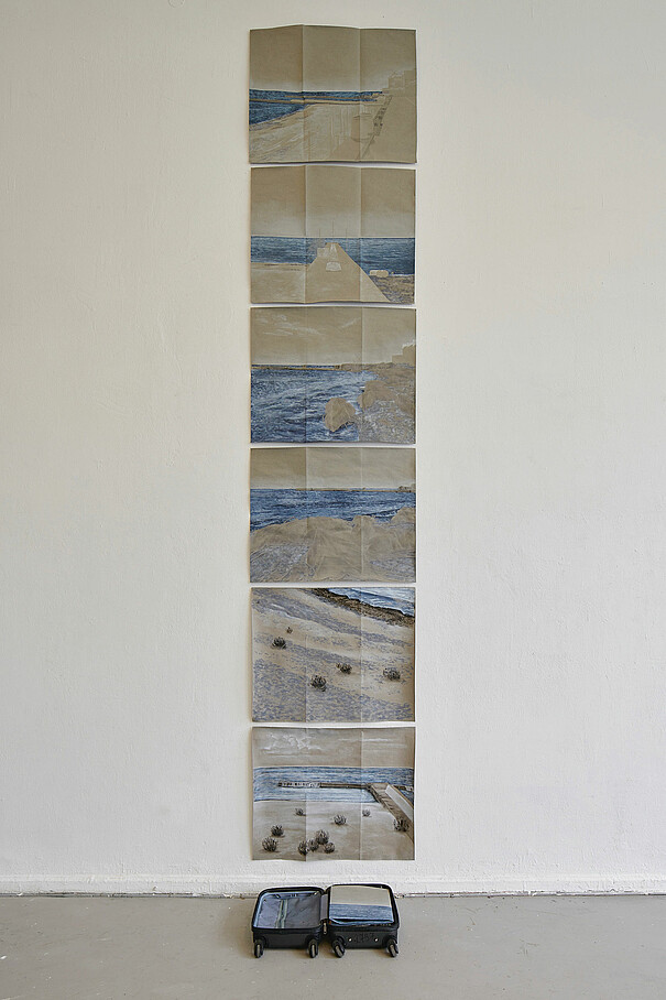 7 Blätter, je 69 x 85 cm Öl und Acryl auf Papier, ein Reisekoffer
