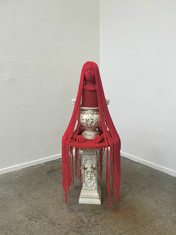 Sarah Ama Duah, „Gold, Cocoa. A Beeswax portrait“, 2025 Bienenwachs, Pigment, Wolle 50 x 80 x 175 cm Sarah Ama Duah, „Mother of Many. A Beeswax portrait“, 2025 Bienenwachs, Pigment, Wolle 100 x 100 x 185 cm