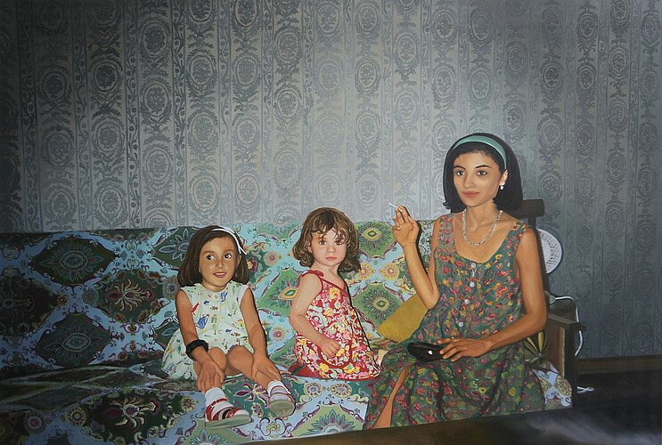 Die Arbeit basiert auf einem Foto, aufgenommen von meinem Vater in Tiflis in den späten 1980er Jahren. Darauf sind meine Mutter und meine Cousinen zu sehen. Ich bin in Deutschland geboren und aufgewachsen, nachdem meine Mutter Georgien in den Neunzigern verlassen hat. Für mich ist Georgien ein Ort, der nah und fern ist – ein Teil von mir, den ich nie ganz greifen kann. Dieses Bild ist meine Art, diese Lücke zu füllen, eine Annäherung an eine Geschichte, die mich geprägt hat, auch wenn ich sie nur bruchstückhaft kenne. Das Bild ist meine Art, georgisch zu sprechen – ohne Worte, durch Erinnerungen.
