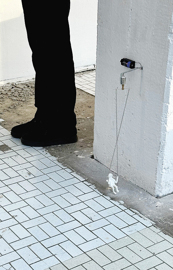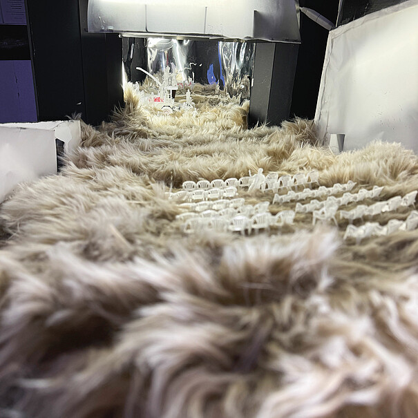 Kappa, Spiegelfolie, Fake-Fur-Teppich und bemalter Sand, Stühle und Menschen aus PETG im 3D-Druck, Transparentpapier, Mähdrescher-Spielzeug