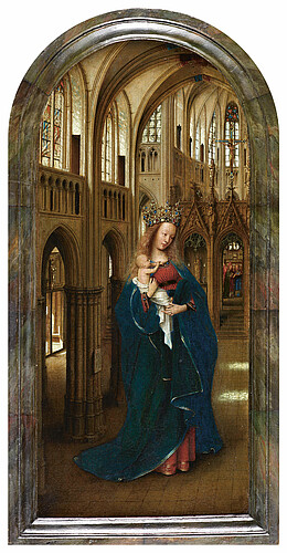 Schauen wir noch einmal die Madonna an … Vieles ist erfunden, zum Beispiel ihre Krone. Wie Gold, Schmuck, Edelsteine leuchten – das hat van Eyck ganz sicher gesehen. Aber eine solche Riesenkrone kann es gar nicht geben, auch nicht im Verhältnis zu ihrem Kopf. Hat man aber das Prinzip begriffen, kann man auch neu erfinden. Die Grundvoraussetzung ist, zu erkennen, dass die Dinge, das Erscheinungsbild der Dinge und die Begriffe von den Dingen zwei verschiedene Sachen sind. Die ganze frühere Malerei vor van Eyck ist, wenn Sie so wollen, begrifflich. Das heißt zum Beispiel: Ein rotes Gewand malt man rot, und ein blaues Gewand blau, einen goldenen Gegenstand in Gold. Das ist eine Vorstellung, die rein begrifflich ist. Van Eyck aber lässt den Saum des Kleides der Madonna nur an ein paar Stellen aufblitzen und an anderen Stellen nicht. Wenn der Saum im Schatten ist, sieht man ihn nicht. Deswegen sieht es auch „echt“ aus.