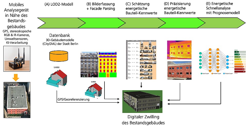 Im vom BMWSB geförderten Forschungsvorhaben FACaiDE wird eine mobile Analysemethode zur automatisierten Bestimmung der Energieeffizienz von Gebäudefassaden des Bestands entwickelt, indem Methoden des Building Information Modelings, der optischen und thermischen Messtechnik sowie der künstlichen Intelligenz (KI) kombiniert werden. Das Forschungsziel besteht in der weitgehend automatisierten Bestimmung von Energieeffizienzparametern von Gebäudefassaden, wie z.B. Baualtersklasse, Geschossanzahl, U-Werte sowie Flächenanteile opaker und transparenter Fassadenanteile mit Hilfe eines als Demonstrator entwickelten mobilen Analysegeräts in unmittelbarer Nähe zum Bestandsgebäude. Diese Parameter fehlen in digitalen LOD2-Stadtmodellen des Bestands heute meist noch flächendeckend und sollen auf diese Weise einfach erhoben und ergänzt werden können.