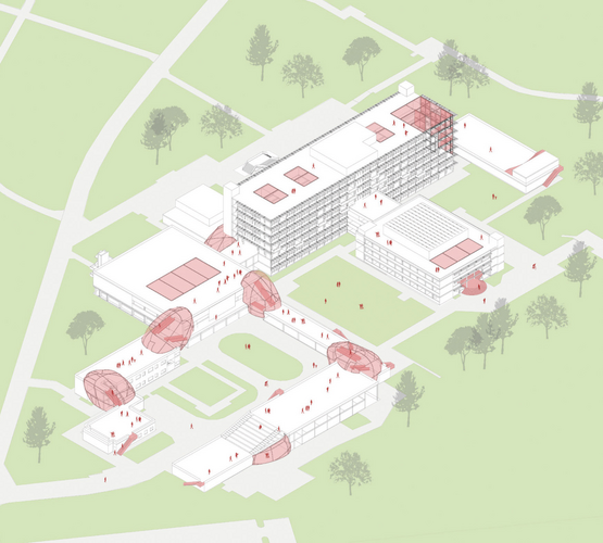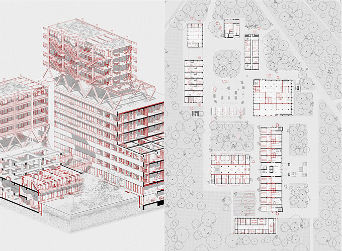 Das seit 2007 leerstehende ehemalige Stasi-Krankenhaus Buch soll entgegen der ursprünglichen Abrisspläne erhalten und in ein hybrides, multifunktionales Großgebäude umgenutzt werden, um sowohl ökologische als auch geschichtliche Erwägungen zu berücksichtigen. Mit dem Ziel, das Gebäude als Zentrum eines geplanten Stadterweiterungsgebiets zu revitalisieren, werden verschiedene Ansätze zur Verbesserung der Raumqualität und Nutzungsmöglichkeiten untersucht. In Zusammenarbeit mit der städtischen Wohnbaugesellschaft HOWOGE, mit orange architekten und Studierenden der Universität Kassel.