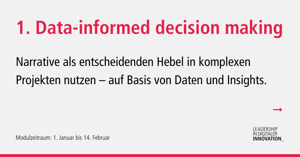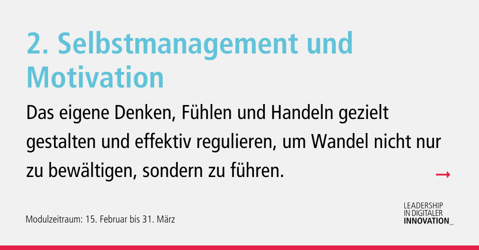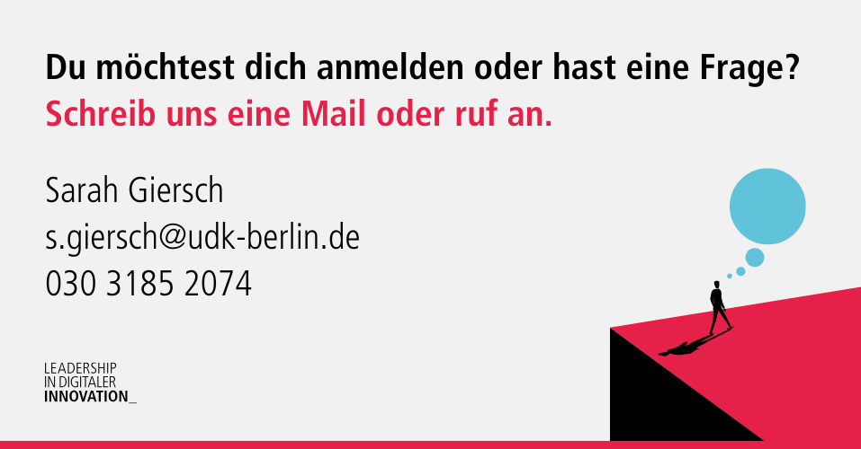 Wir zeigen euch, was zeitgemäßes Arbeiten und Führen ausmacht. Der neue digitale Raum verlangt andere Arbeitsumgebungen und agile Unternehmenskulturen. Leadership in digitaler Innovation gibt euch die nötigen Methoden und Strategien an die Hand, um in der Arbeitswelt von heute erfolgreich zu bestehen und zukünftige Entwicklungen bewusst mitzubestimmen.