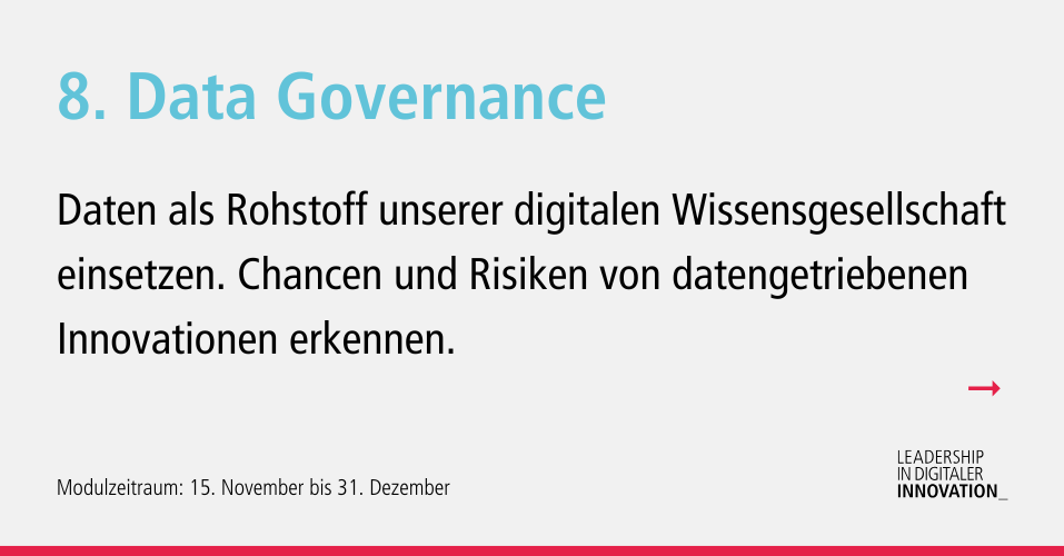 Daten als zentraler Rohstoff in der digitalen Welt ermöglichen zahlreiche Innovationen, bergen aber auch Risiken in Bezug auf die Schutzbedürfnisse von Individuen und Organisationen. In diesem Modul lernst du verschiedene Interessen in Einklang zu bringen und den Wert von Daten auszuschöpfen. In aktuellen Fallbeispielen lernst du rechtliche Aspekte, mit Akteurinteressen und Plattformlogiken zusammenzudenken und strategisch anzuwenden.