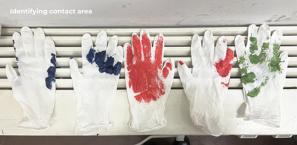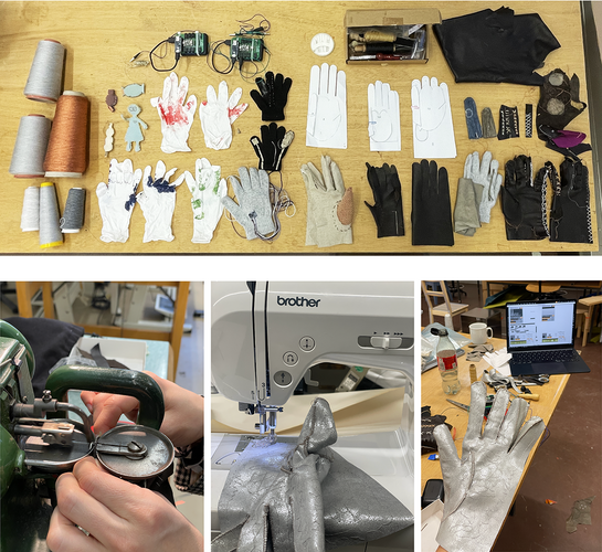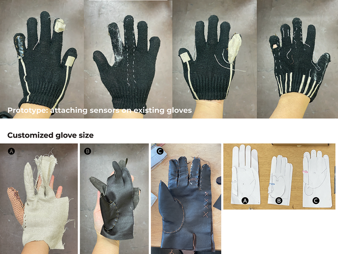 Our first step was mapping real-life hand gestures using spray paint to identify key contact areas for sensor placement. Next, we tested different glove sizes and materials to determine the optimal base. We then explored ways to make these areas responsive, experimenting with various materials such as stretchable threads, wool, pressure sensors, and accelerometers.