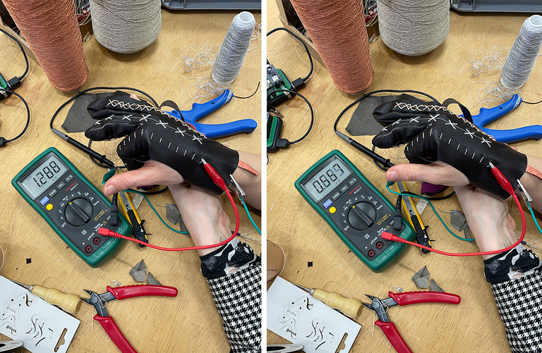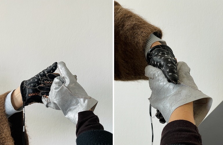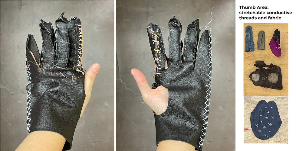 For the electrical and sensor elements, we refined our stitching patterns, integrating conductive copper threads on the outer layer for contact-based input and stretch yarn inside to capture motion. This layered approach enabled dual-input functionality: recognizing touch with another glove while also detecting hand movements and gestures.