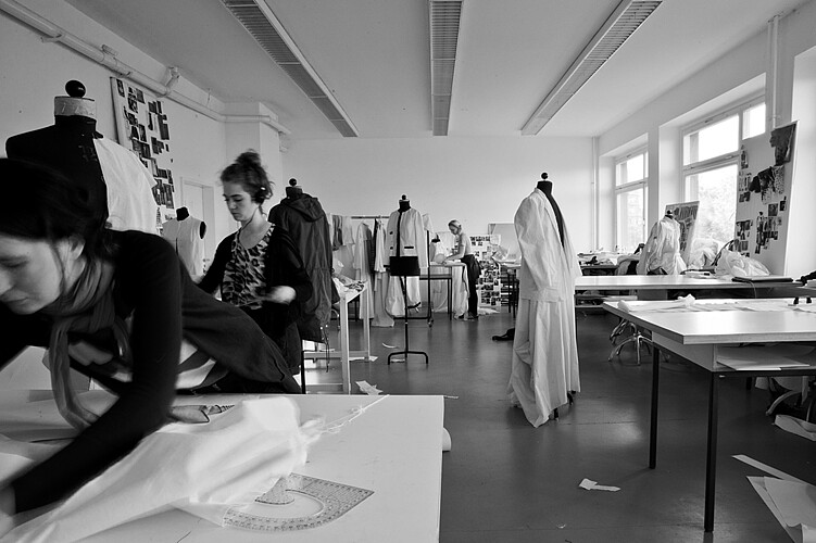 Die Werkstatt für Schnittkonstruktion ist mit großen Tischen und Kleiderständern ausgestattet. Für die Realisierung ihrer Projekte, können sich Studierende aus dem Schnittarchiv Grund- und Modellschnitte sowie die dazu gehörenden Nesselmodelle ausleihen. Grundlagen der Schnittkonstruktion werden im ersten Jahr vermittelt. Im zweiten Jahr liegt der Fokus auf der Entwicklung von Modellschnitten und Drapage.