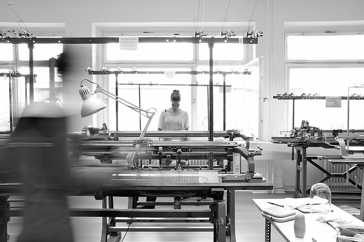 In der Strickwerkstatt haben die Studierenden die Möglichkeit, mit einem vielfältigen Angebot an Garnen und Techniken zu arbeiten. Sie können sowohl die Herstellung von Maschen auf industriellen Strickmaschinen als auch auf Handstrickmaschinen vertiefen und sich mit verschiedenen Strick Bindungen sowie deren experimentellen Ableitungen auseinandersetzen.