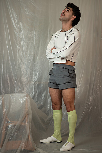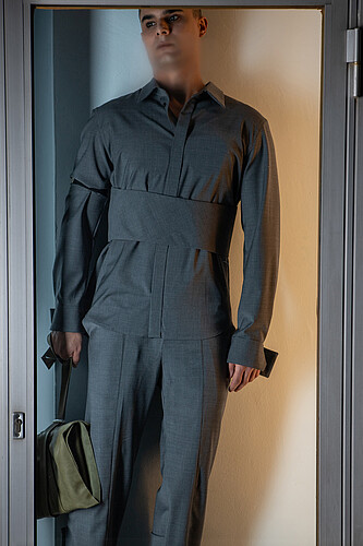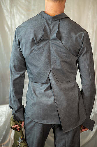 (Witnessing how standardized dress codes restrict individual identity sparked my drive to redefine masculinity through more fluid, personal expressions. Exploring body-conscious details allows for innovative ways to convey sensuality and individuality without overt challenges to social expectations. By questioning masculine stereotypes, I aim to create designs that resonate with a wider range of personal identities and cultural contexts. integrating my own experiences of navigating strict environments, I sought to translate these insights into design solutions that subtly empower the wearer.)