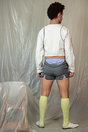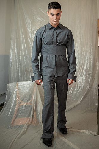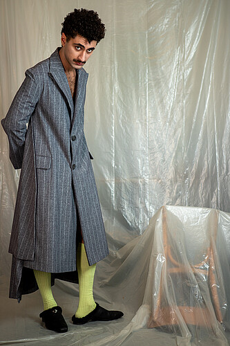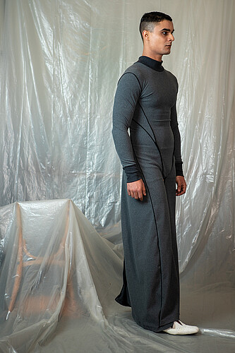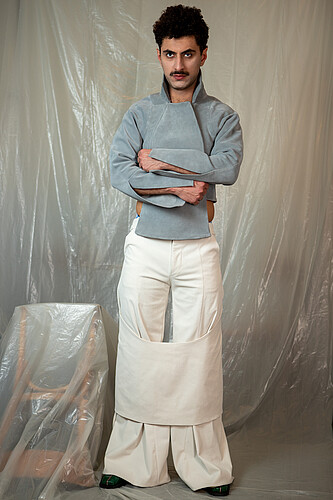 Growing up in Iranís strict dress-code environment underscored how clothing enforces conformity. Even minor deviations in length or color risked censure, revealing how menswear can operate as a form of social control. This experience sparked my interest in using subtle design shiftsóseams, silhouettes, and layered fabricsóto quietly subvert rigid norms and nurture personal expression without overt rebellion.