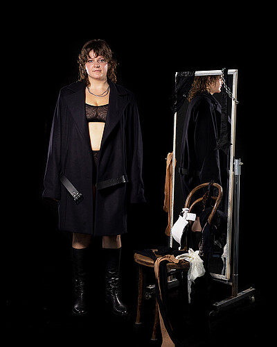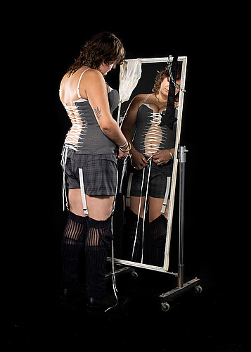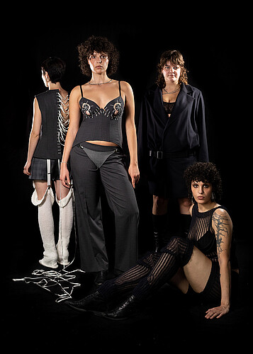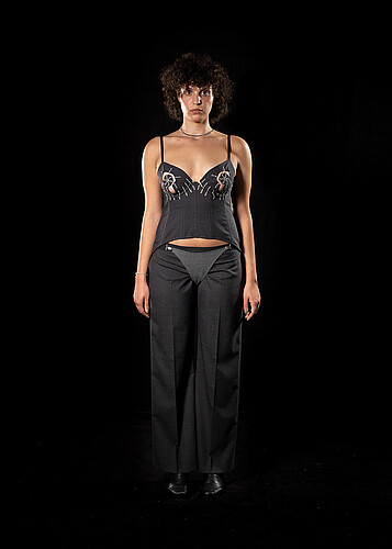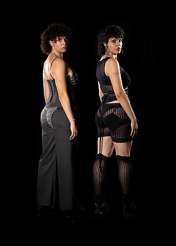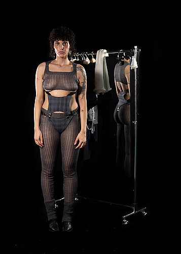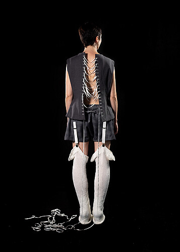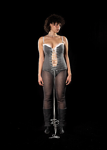 This collection explores the relationship between body and fashion, focusing on the physical formation and deformation of one another. Through historical and contemporary trends, it examines how clothing constructs the feminine body and deviates from the norm, hinting at the rebellion of the body through un-tightened corsets and loose and deformed knit. The research blends historical study with sensory exploration. Inspired by underwear, the designs incorporate adjustable closures and straps to emphasize adaptability and bodily autonomy.