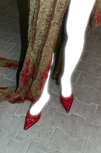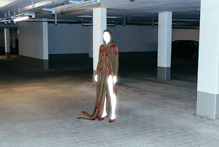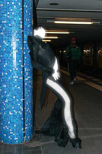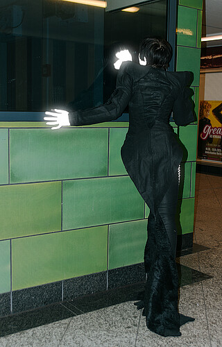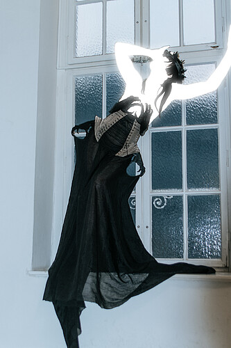 Baba Yaga is the guardian of the boundary between worlds, a trial that the hero must face. In her costume, witch-like hands grasp the body and lift the skirt, creating the illusion of animated garment, as if the material itself has become part of her being.