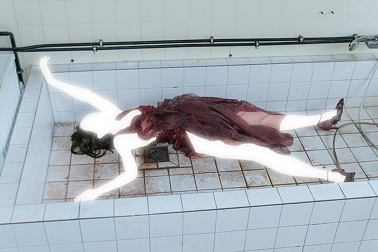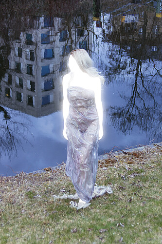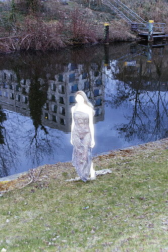 Rusalka lingers at the threshold between worlds—her drapery, resembling wet skin glowing underwater, appears frozen in motion, while strands of hair are woven into the fabric, becoming one with it.