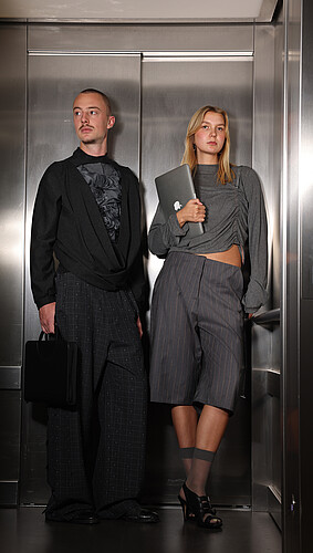 What do I wear when things get serious? Between a post-student career launch and a wardrobe crisis, my project creates garments that, with their transformative nature, act as a mediator in life transitions of emerging adults. Traditional fashion hierarchies and expectations in the professional world are questioned with compromises between individuality and convention. Shape and material bridge the nostalgic attachment to a student identity and the brave steps towards professional development. An ode to the lecture hall and a warm welcome to the meeting room.