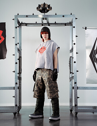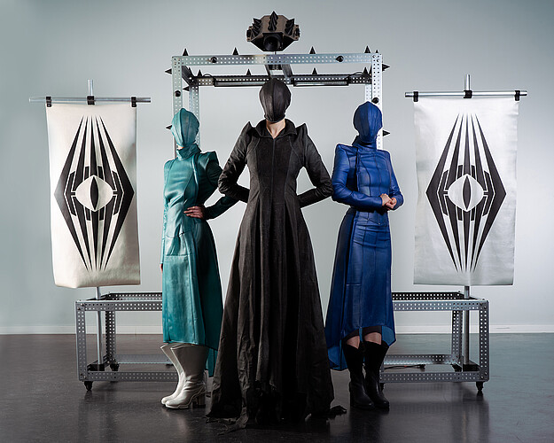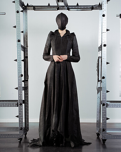 In meiner Bachelorprojekt „Panopticon“ geht es um eine Dystopie, in der die Gesellschaft mittels KI gestützten Überwachungssystemen von einer kleinen Minderheit überwacht wird. Das Machtgefälle wird anhand folgender drei Gruppen visualisiert und soll einen überspitzten Ausblick auf die Zukunft von Gesellschaften bieten, falls die totalitären Gedanken einzelner weiter an Zustimmung gewinnen. Die gesamte Kollektion ist dabei aus Leder entwickelt, welches ich in meinem Praktikum bei Eccoleather selbst designed und angefertigt habe. Ruler – die herrschende Elite, die sich durch technologischen Fortschritt und KI-Überwachungssysteme an die Spitze gesetzt hat. Sie haben sich durch ihre Mittel von der restlichen Bevölkerung entfremdet und verkörpern absolute Kontrolle. people – die unterdrückte Mehrheit, die durch eine strenge Kleiderordnung uniformiert und ihrer Individualität beraubt wird. Sie repräsentieren Machtlosigkeit und Anpassung. Riots – eine Widerstandsbewegung aus Akteuren beider Gruppen, die sich der Überwachung durch Tarnung und Sabotage entziehen. Sie stehen für Hoffnung und Veränderung.
