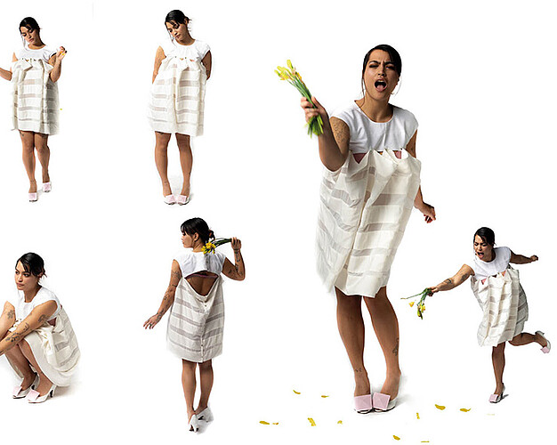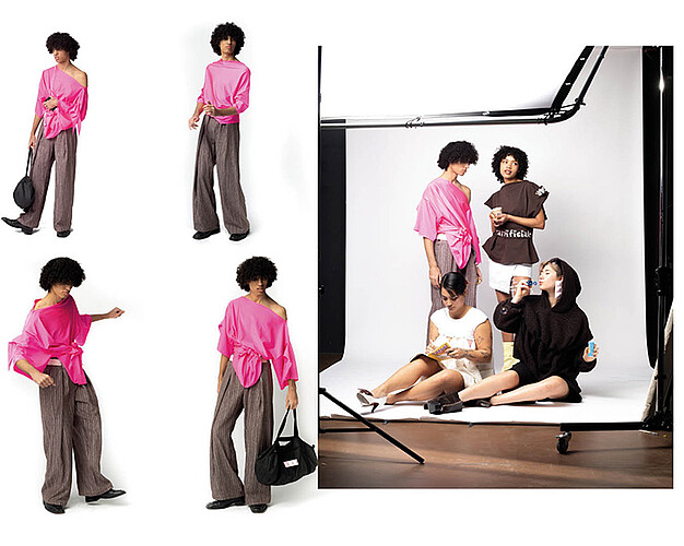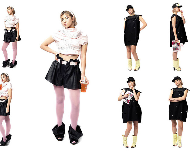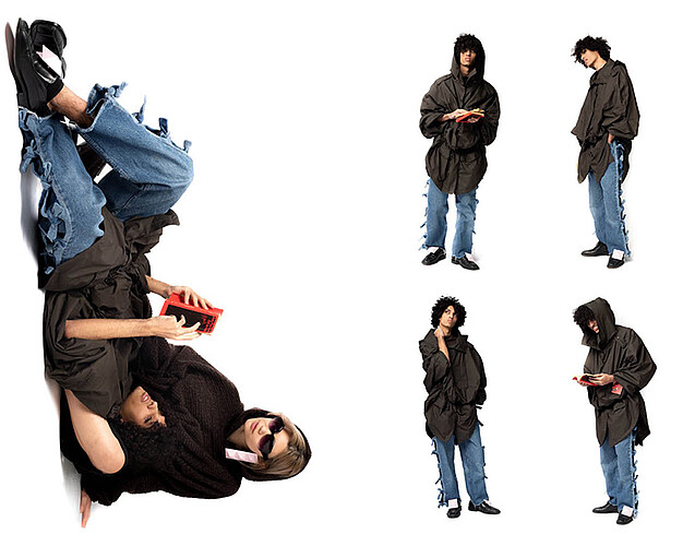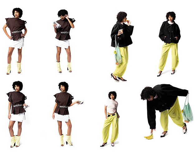 The collection is built on adaptability: all pieces allow for size adjustments, achieved through geometric pattern-making and versatile fastening systems. The garments address the human desire for adornment. Through modular add-ons and multiple styling options, they provide a playful alternative to constant consumption.