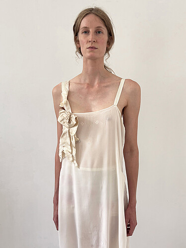A Single Thread explores beauty and relevance found in imperfection of existing textiles, weaving together dreams and sensitivity through a collage-like method. Rooted in archival research and a focus on craftsmanship, it joins individual elements in revealing their origins and emotional dimension, with a guiding motif inspired by a single thread dating back to the year 1870. The work challenges notions of flawlessness, embracing escapism and romanticism and reflects on the tension between the urge to mind and the power of acceptance.