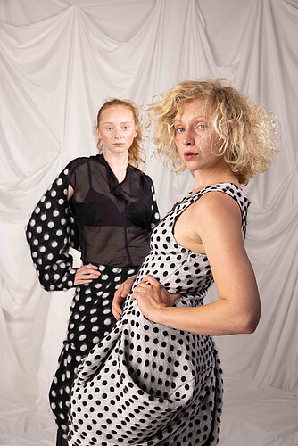 Die Kollektion „inbetween dots“ erforscht die Oberfläche, die den Raum zwischen Körper und Kleidung definiert. Die Silhouette eines Körpers wird durch Kleidung immer verändert. Wie beim Blick durch ein Guckloch, wird die Wahrnehmung des Körpers verzerrt, Konturen verschwimmen. Dieser Eindruck wird durch grafische Effekte auf die stoffliche Oberfläche übertragen.