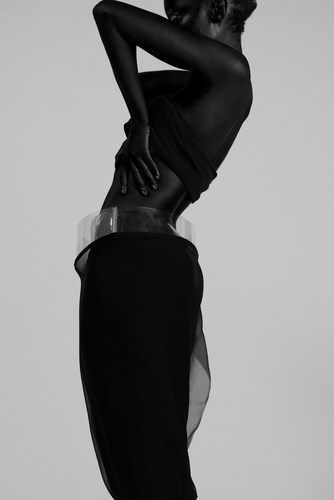 The collection consists of three looks, that each consist of two layers. The inner garment, made from viscose crepe and bias cut, hugs the body. The outer layer plays the role of the movement shadow which is translated with the help of silk chiffon.