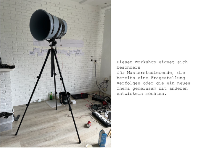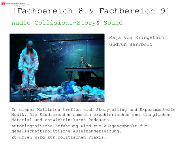 In this collision, storytelling and experimental music meet. The students collect narrative and sonic material on self-selected topics. From this material, short biographically inspired podcasts are developed using the simplest technical means. Autobiographical experience serves as a starting point for socio-political engagement, and listening becomes a political practice. This workshop is particularly suitable for master’s students who are already pursuing a research question or who wish to develop a new topic together with others.