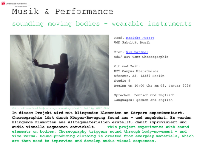 This project experiments with sound elements on bodies. Choreography triggers sound through body-movement - and vice versa. Sound-producing clothing is created from everyday materials, which are then used to improvise and develop audio-visual sequences.