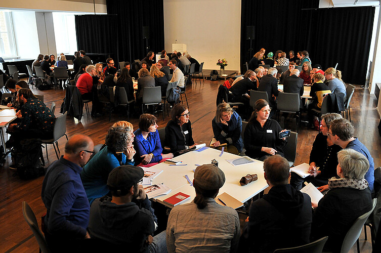 Die Analyse von Fabian Scheidler ist nicht neu und knüpft an postkoloniale und dekoloniale Ansätze an. In einem einstündigen, zugänglichen Vortrag schlägt er den Bogen von den globalen Krisen unserer Zeit, über eine Analyse des westlichen globalen Systems, bis zur Rolle der Kultur und des Theaters[2]. Aber diese Analyse an den Beginn dieser Tagung zu setzen, ermöglichte es, fundamental darüber nachzudenken und zu diskutieren, wie die in der künstlerisch-pädagogischen Praxis häufig verwendeten Begriffe wie Theater, Bildung, Subjekt und Welt neu definiert werden können und diese Neudefinition das Arbeiten im theaterpädagogischen Kontext transformiert. Diese Fokussierung und Vertiefung erfolgte durch den Vortrag von Prof. Dr. Kristin Westphal zum Thema “Anthropozentrismus-kritische Diskurse und Zugänge in Kunst und Bildung”. Zwei Podiumsgespräche und ein Abendprogramm im Marktplatz-Format boten einen Raum, sich weiter zu vernetzen und über das zuvor Gehörte auszutauschen.