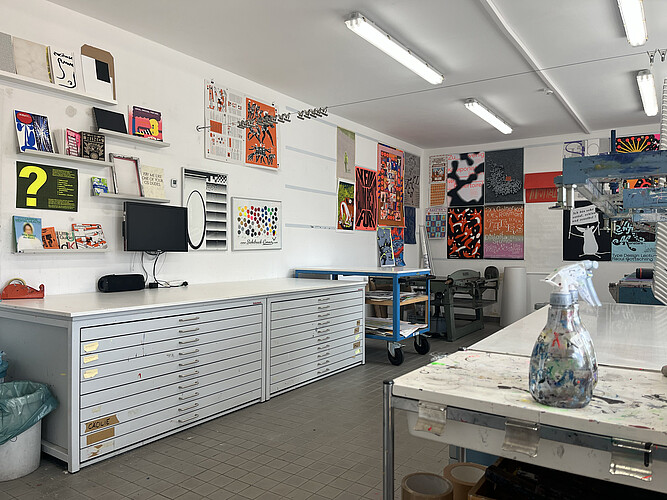 In der Werkstatt für Siebdruck vom Studiengang Visuelle Kommunikation können Studierende ihre Entwürfe handwerklich umsetzen, die Materialität eines Druckverfahrens erfahren und damit experimentieren. Ob über eine Handzeichnung oder die digitale Druckvorlagenerstellung, ob über die Erstellung einer fotografischen oder aus Papier geschnittenen Schablone, bietet die Werkstatt unterschiedliche Zugänge in die Welt der künstlerischen, handwerklichen und auch industriellen Druckproduktion.