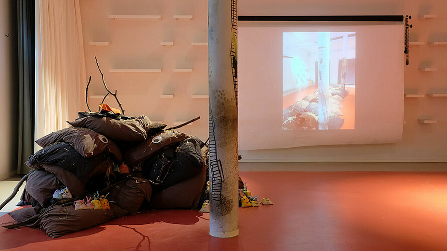 Kissen über Kissen türmen sich in die Höhe. Der Berg aus Braun-, Erd- und Schlammtönen knistert lautlos. Tatsächlich lugen hier und da trockene wie ausgedroschene Halme der Gerstenpflanze aus den weichen Fugen der Textilinstallation. Beim Näherkommen lassen Stöckchen wie diverse Wollreste und Stofffetzen Arme und Haarschopf erkennen. Es gibt keinen Zweifel: Das amorphe Gegenüber ist nichts weniger als Ihre Hoheit Matsch! Oder die Prinzessin aus »Schlammland«, die die Protagonistin Yuki durch eine Art Unterwelt begleitet und damit unterstützt, mit ihren Gefühlen umzugehen - ohne Angst und Scham.