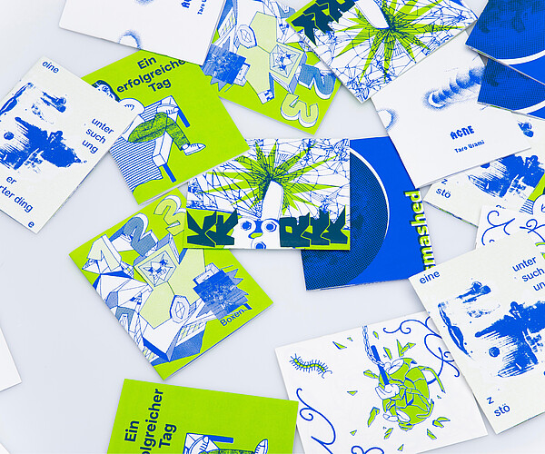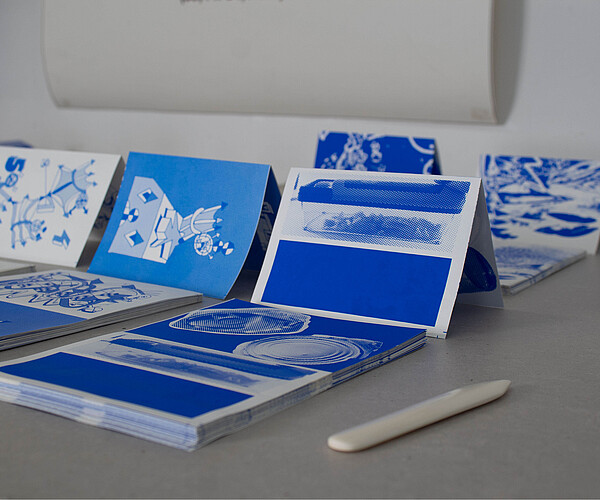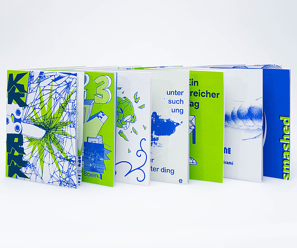 Es entstanden 7 Zines im Format 11×14cm in einer Auflage von 25, welche im Siebdruckverfahren in Ultramarine Blue und Bright Green von Hand gedruckt und gebunden wurden.