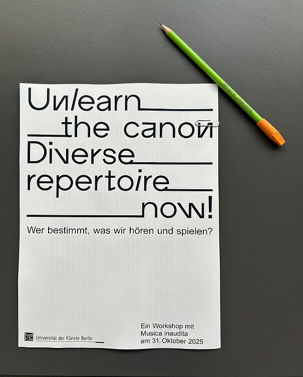 Wir sind eine Initiative an der Universität der Künste Berlin, die sich dafür einsetzt, auf strukturell diskriminierende Realitäten der klassischen Musikwelt aufmerksam zu machen. Unser Anliegen ist es, Komponist*innen hör- und sichtbar zu machen, die aufgrund ihres Geschlechts, ihrer sexuellen Identität, sozialen oder nationalen Herkunft, Hautfarbe, Religion, Sprache, Behinderung oder politischer Anschauung marginalisiert werden. Wir wollen, dass die Musik dieser Komponist*innen eine Selbstverständlichkeit auf den Bühnen und in den Unterrichtsräumen wird!