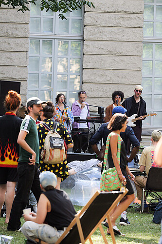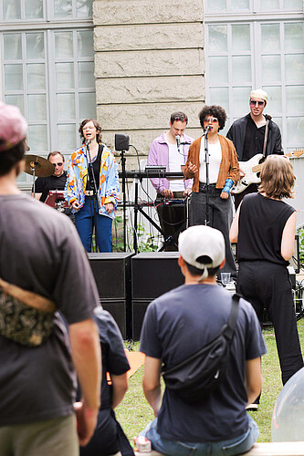 We invite the inclusive band 21 downbeat from RambaZamba Theater to ask with trance, and euphoria as well as roar, and confetti: Where are the limits of institutional art education and what could alternatives look like? The band creates an individual sound from both their own texts and poems by contemporary authors, beyond conventional boundaries and ideas.