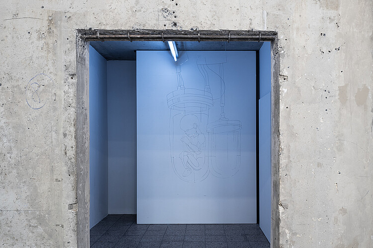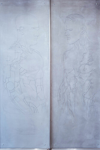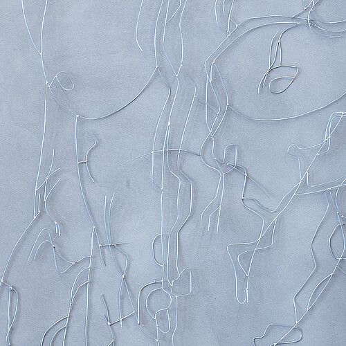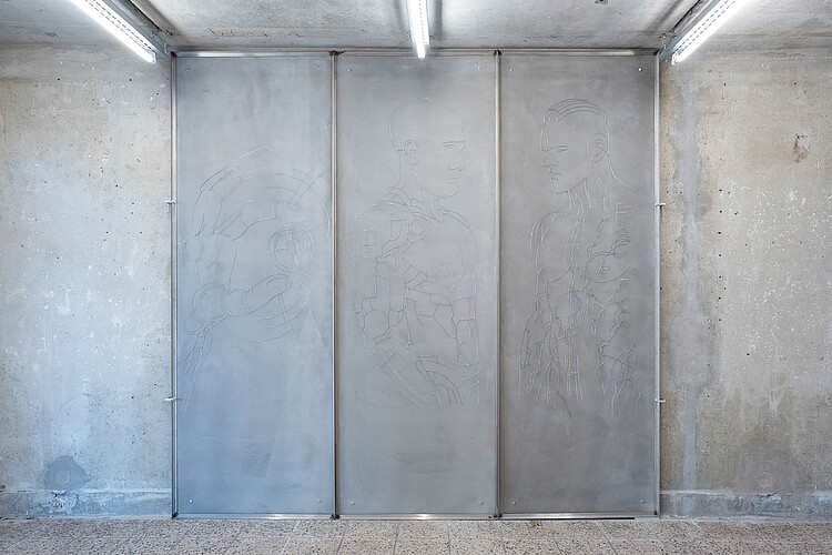 Hartenstein zerlegt diese Segmente und übersetzt sie in eine queere Zukunftsperspektive. HDL überführt Motive und Kompositionsprinzipien des Mosaiks in lineare Metallzeichnungen auf Beton, die durch Lötverbindungen zusammengehalten werden. Die Linie fungiert als konstruktives und fluides Element, hält und destabilisiert zugleich. Die Arbeit untersucht, wie gesellschaftliche Ordnung über monumentale Kunstwerke im öffentlichen Raum organisiert wird und wie Reduktion, Verschiebung und Materialwechsel neue Lesarten von Kunst am Bau eröffnen.