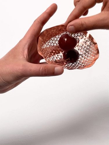 Machen Sie eine Schale aus einer Scheibe. Push Mini wird als flache Metallplatte geliefert, der Sie mit Ihren Fingern eine einzigartige Form geben können. Durch sanften Druck können Sie ein kleines Gefäß zur Aufbewahrung von Wertgegenständen wie Ketten und Ringen oder von Kleinigkeiten wie Schlüsseln und Make-up schaffen. Push Mini ist eine Kombination aus mathematischen Geometrien und bester Handwerkskunst.