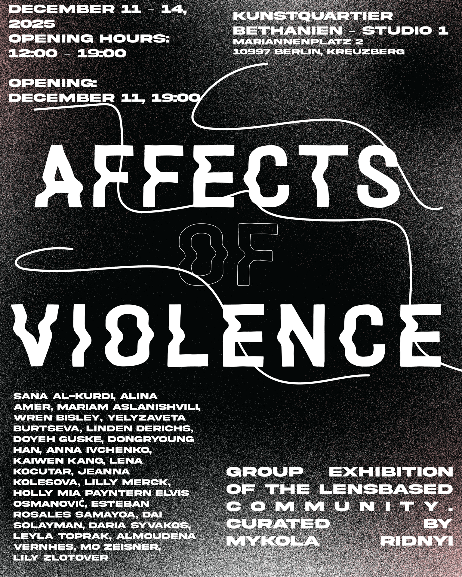 Die Lensbased-Community bildete sich aus der Multimedia-Kunstklasse an der Universität der Künste Berlin, die unter der Leitung von Professorin Hito Steyerl entwickelt wurde und seit 2023 von Mykola Ridnyi geleitet wird. Diese Community besteht aus Studierenden der Klasse, Alumni, Freund:innen und Kollaborateur:innen mit diversen nationalen und kulturellen Hintergründen.Internationale Solidarität und gegenseitige Unterstützung sind ihnen wichtig. Persönliche Erfahrungen von Gewalt, Darstellungen kollektiver Traumata und komplizierte Beziehungen zu nationalen Erinnerungen und Geschichten sind zum Gegenstand der künstlerischen Auseinandersetzung in der Ausstellung geworden.
