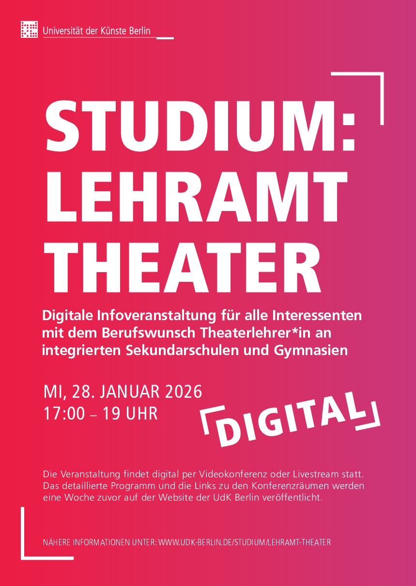 Vorstellung der Studiengänge Lehramt Theater/Darstellendes Spiel: Welche Inhalte erwarten Dich? Wie sind die Studiengänge aufgebaut? Was gilt es bei der Bewerbung an der UdK Berlin zu beachten?